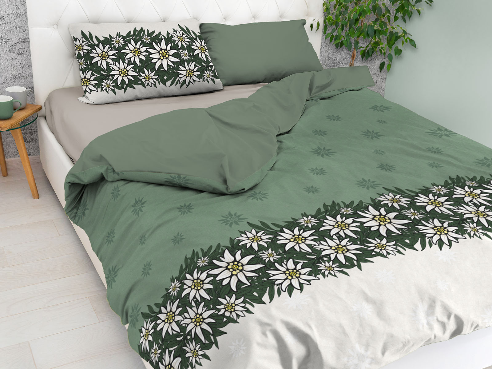 Bettwäsche ALPIFLORA Grün mit Edelweiß-Motiv im Alpenstil – 100% Baumwolle Garnitur