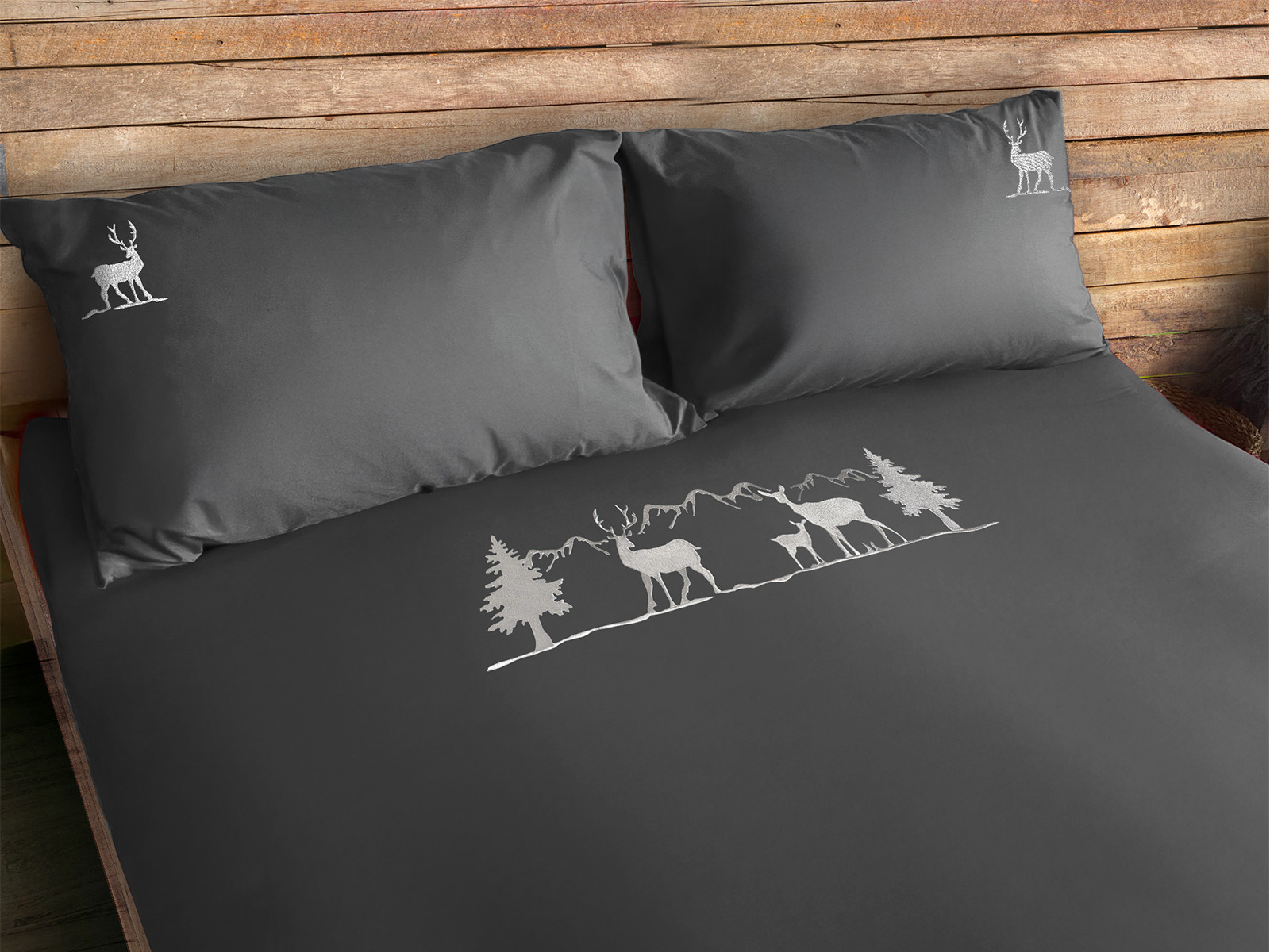 Bettwäsche aus satiniertem Stoff, mit Hirsch- und Berg-Bestickung, MOUNTAIN anthrazit